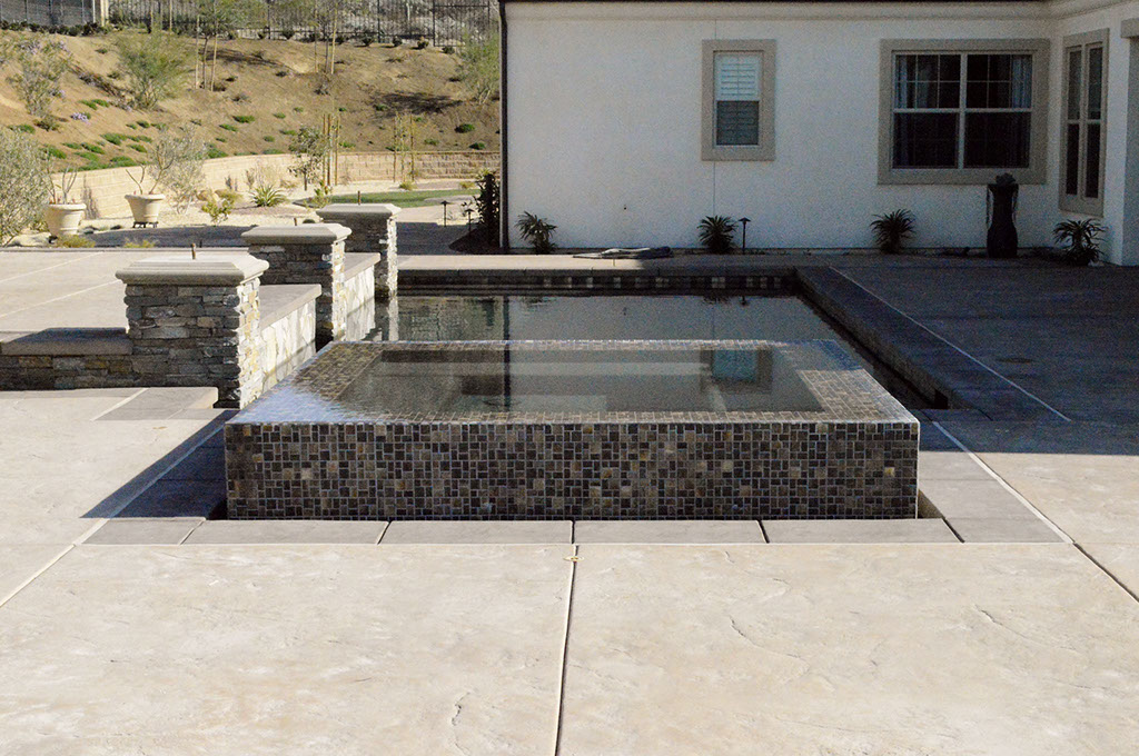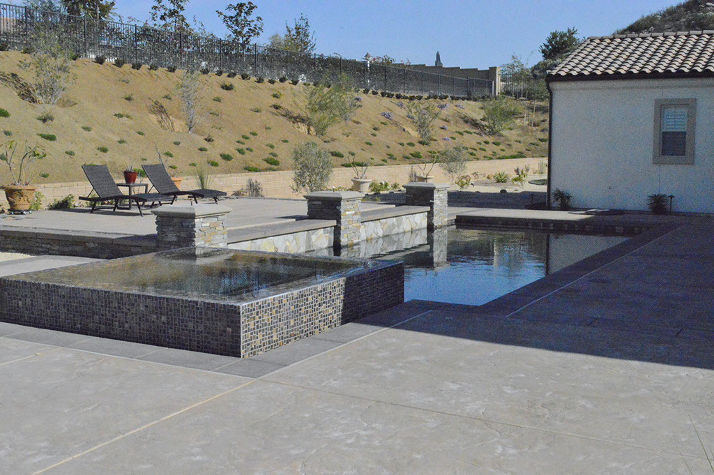 The Wertz Residence bred a design that is very unique within itself. Superior Concrete expressed much creativity in the use of light-colored stone veneer placed on walls and columns, black mulch in various planter spaces, a mixture of patterns and textures on the concrete surfaces, and multiple decorative rock sizes and colors. This is another project that demanded an elegant design layout. Therefore, the swimming pool and spa became the primary focal point of this project. The pool is complimented by a raised back wall with natural stone columns and fire bowls atop each column. In addition, the spa features an “elevated” design with vanishing edges along all four sides. This project has become one of our very favorites to show!